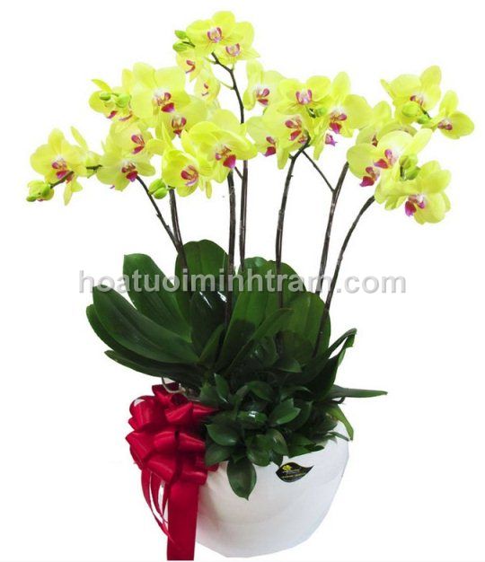 Bình hoa gồm: 07 cây hồ điệp vàng, lá & phụ kiện.